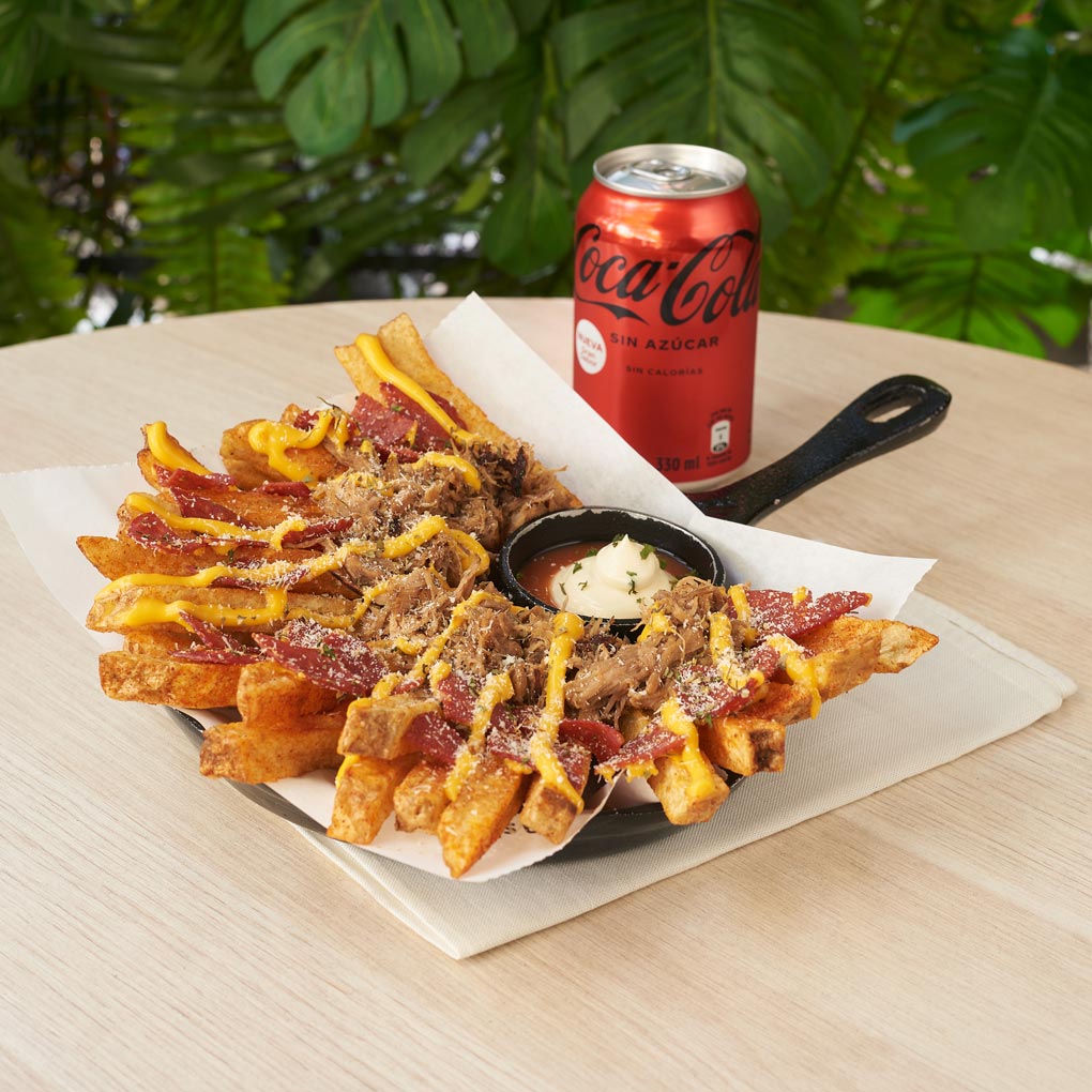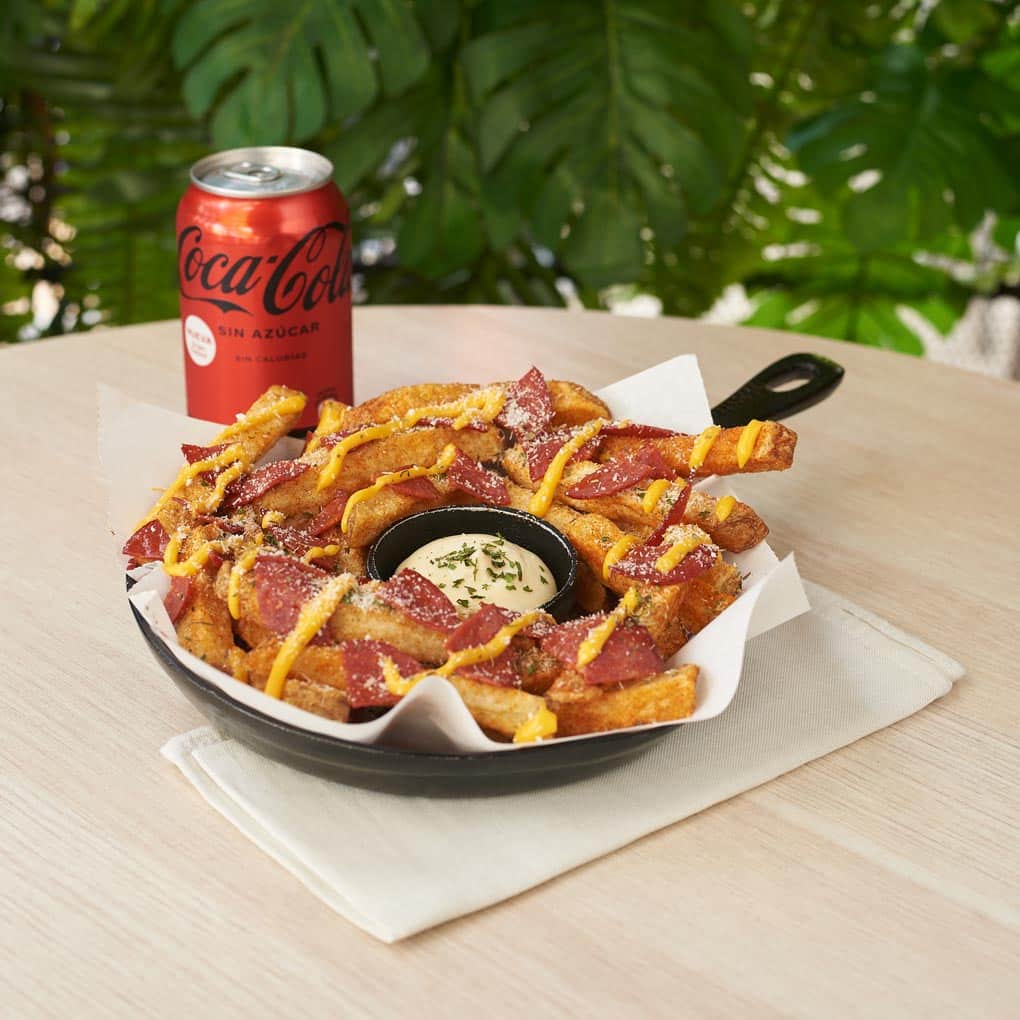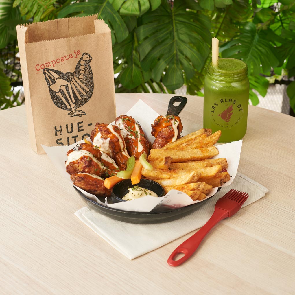2 Platos de alas acompañado con dos porciones de papas, dos elecciones de salsas para las alas vegetales y 2 salsas de la casa.